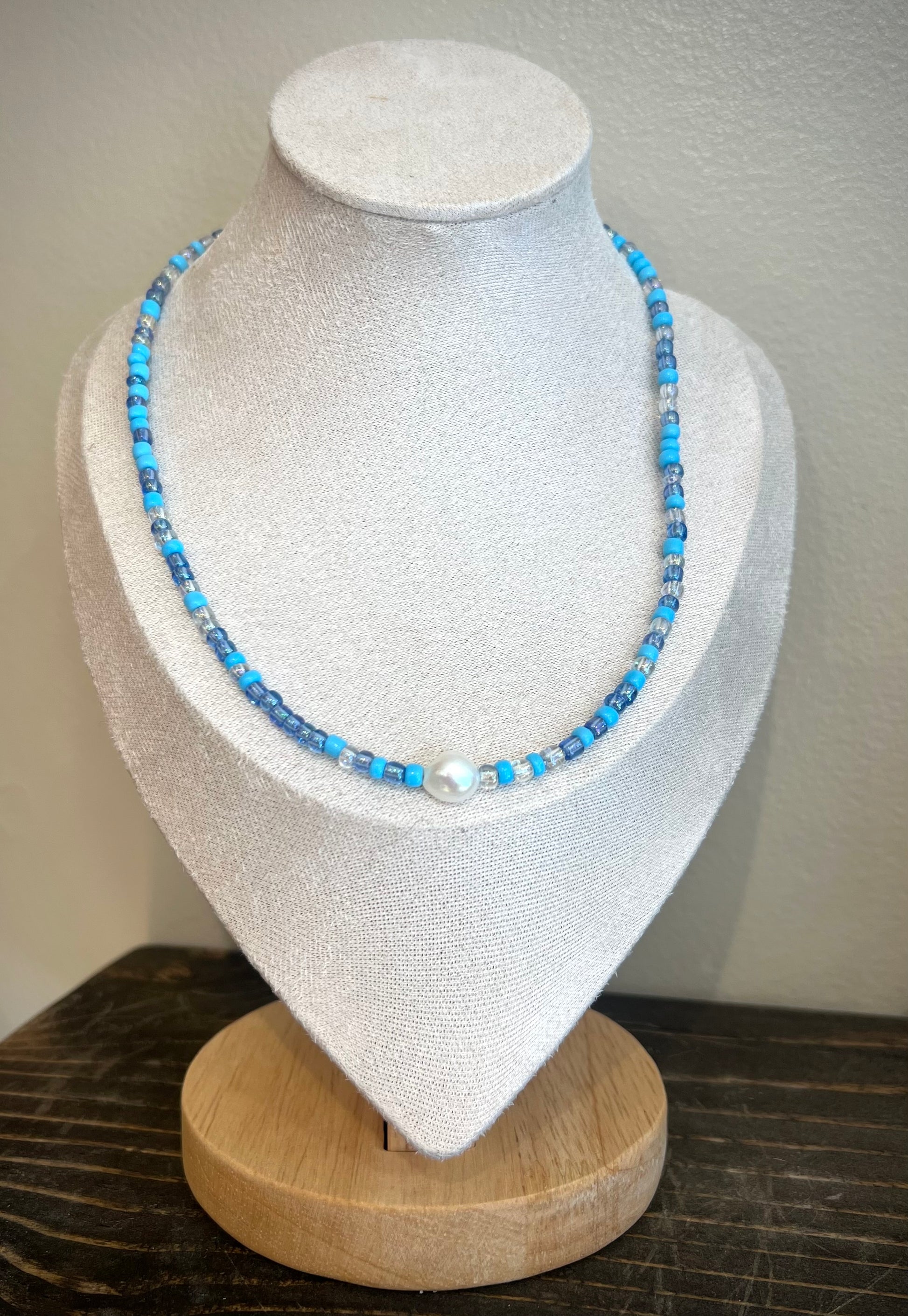 Mini Beaded Necklace / blues + freshwater pearl